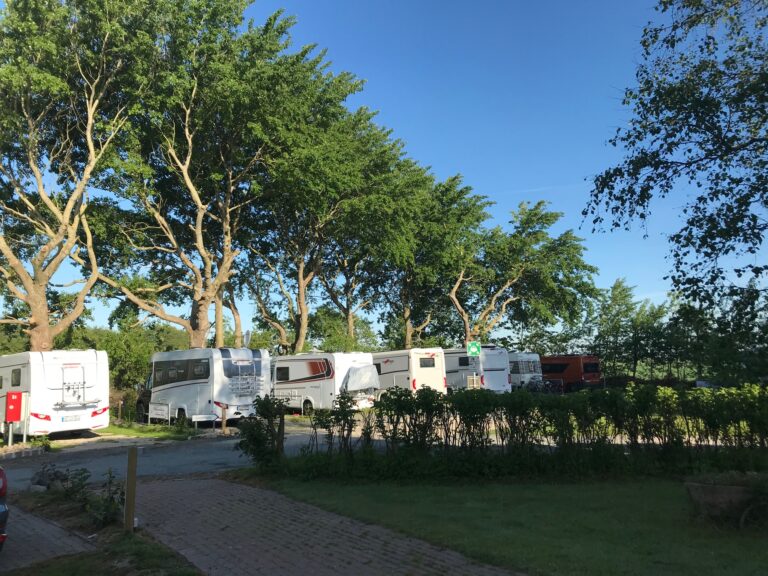 Wohnmobil-Stellplätze am Kooghafen – ruhig gelegen und umgeben von Bäumen.